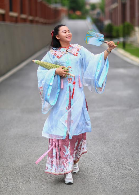 夕阳为校园林荫道披上金纱时,一场“汉服文化漫步”让时光仿佛慢了下来。嘉宾们换上广袖流仙的汉服,或提裙走过青石板路,或凭栏眺望远山——衣袂飘飘间,交领右衽、宽袍大袖的形制之美,让抽象的“传统服饰”变得可触可感。