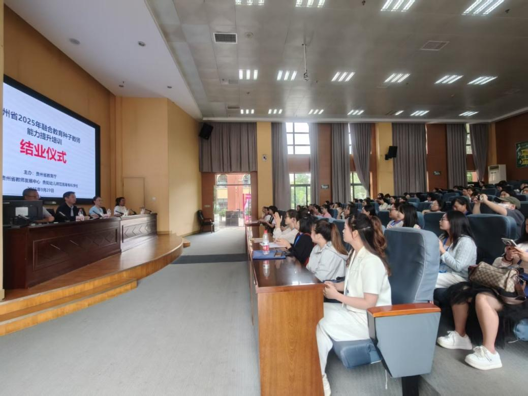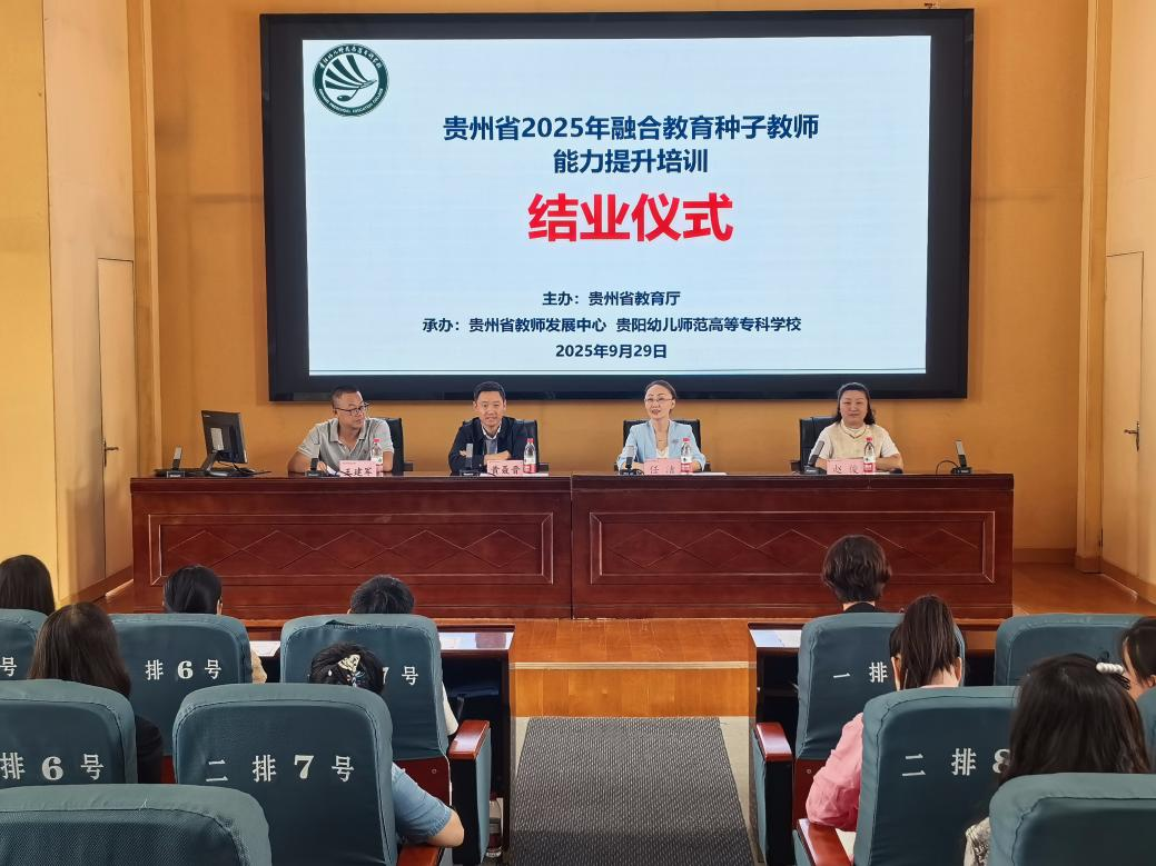 任洁代表学校发言。她首先向省教育厅长期以来对学校工作的支持与关心致以衷心感谢,向顺利结业的100位参训教师表示诚挚祝贺。任洁表示,未来学校将持续在省教育厅指导下,强化融合教育师资培养力度,优化课程体系建设,助力更多学生掌握融合教育专业知识与技能;同时对参训学员提出三点希望:一是保持学习热情,树立终身学习观念,紧跟教育方针政策与前沿理念,提升专业能力,成长为融合教育领域 “行家里手”;二是坚持学以致用,将培训所学知识与经验转化为实践行动,大胆探索、勇于创新,让融合教育理念在幼儿园落地生根;三是发挥示范引领作用,带动身边更多教师参与融合教育,形成“一人带动一群、一群影响一片”的良好氛围,共同为贵州学前融合教育高质量发展贡献力量。