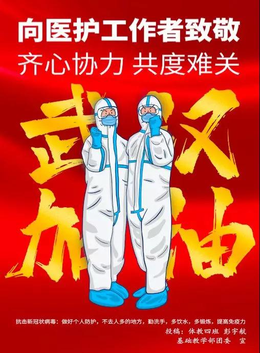 近日来全国抗疫战况捷报频频,感染人数不断减少,出院病例持续增多。一个又一个好消息增添了我们战胜疫情的信心。我们虽然不能奔赴一线,但是我校基础教学部的学子们用自己的方式,向奋战在一线的战士们致敬,给与病魔斗争的病人送去温暖。下面让我们一起来欣赏他们的作品吧!