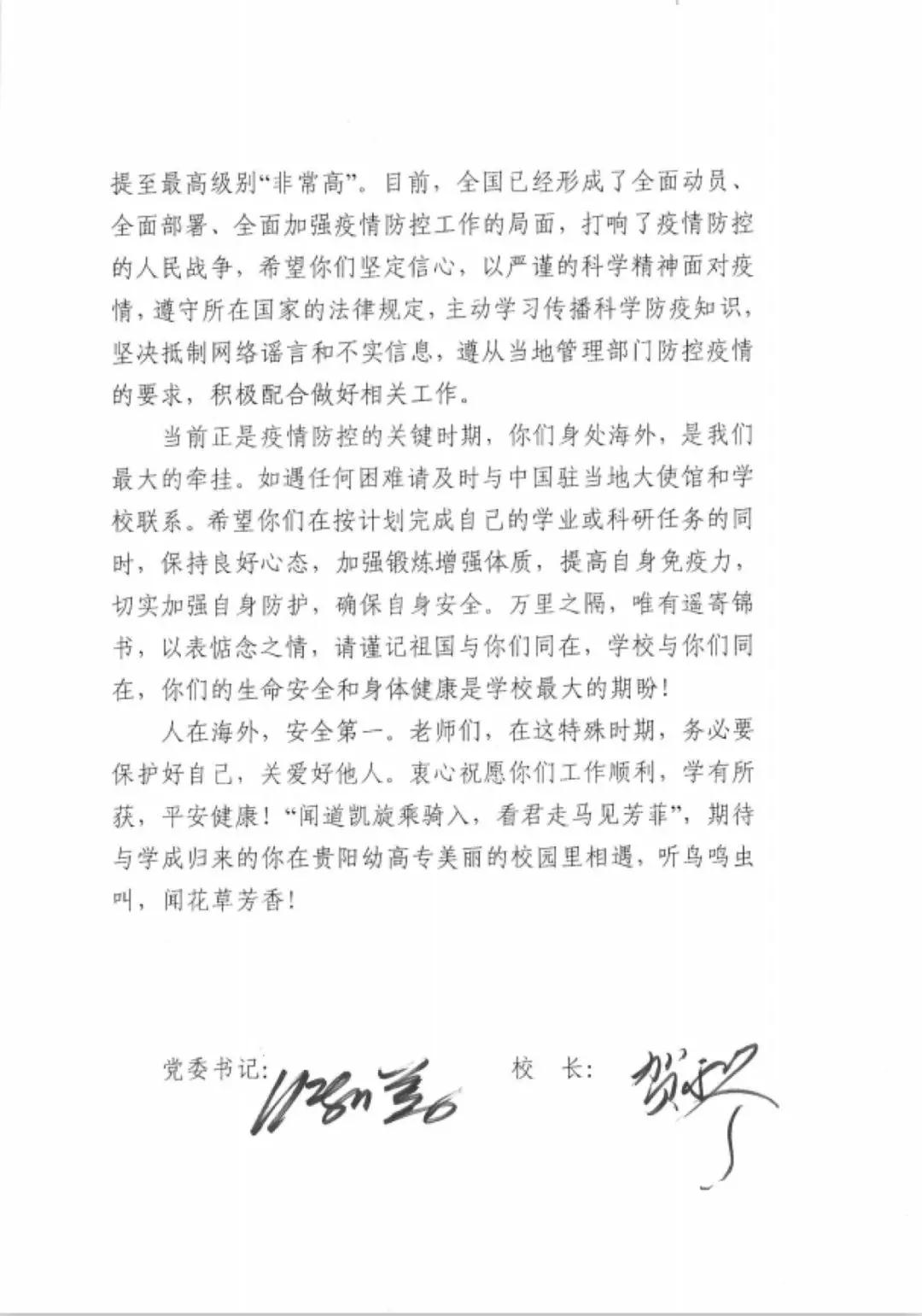 今年以来,新型冠状病毒肺炎疫情牵动着全国亿万人民的心,牵动着海内外每一位幼高专人的心,我校党委书记张曦,党委副书记、校长贺永琴通过致海外教师的一封信,对我校正在国外研修的6名教师表达了关怀和牵挂!期盼身处异乡的他们健康、平安!