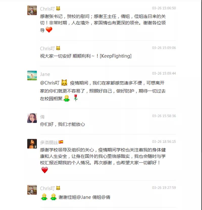 在海外工作学习的6名老师收到慰问信后,即刻在群里表示感谢,字里行间中流露出老师们收获的感动和幸福,他们纷纷表示在海外不仅会认真的完成科研和学业,也会保持良好心态,做好防范工作。