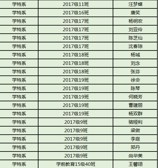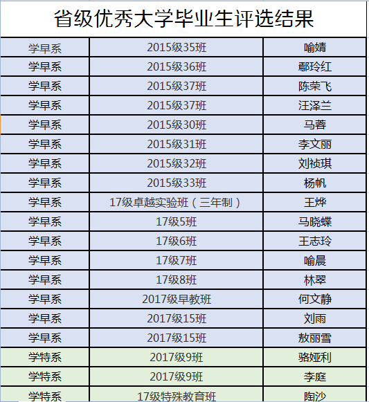 根据《贵州省普通高等学校三好学生、优秀学生干部、优秀毕业生、先进班集体评选办法》(黔教学发〔2018〕169号)、《省教育厅办公室关于开展2020届贵州省普通高等学校优秀毕业生评选推荐工作的通知》(黔教办学函〔2020〕56号)要求,结合《贵阳幼儿师范高等专科学校优秀毕业生评定办法》的规定,经班级申报、系评审小组审核、学校评优评奖委员会办公室审定,同意以下同学荣获“2020届贵州省普通高等学校优秀毕业生”称号及“2020届贵阳幼儿师范高等专科学校优秀毕业生”称号。其中,推荐基础教学部17级软件与信息服务班张灵敏同学入选《追逐梦想2020贵州百名优秀大学毕业生事迹选编》毕业生。