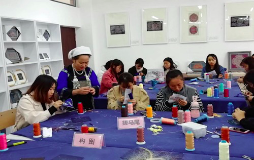 我校与黔南州三都水族自治县水仙马尾绣有限公司于2016年合力成立了“宋水仙大师工作室”,宋水仙会定期对学校产品设计专业学生进行专业辅导。经过宋老师的精心指导,学生们专业技能得到了极大提升了,并因此获得了多项荣誉。在此合作的基础上,学校还成立了民族民间艺术研究中心。目前,我校产品设计专业在民艺产品设计领域办学成效日益突显,团队实力逐年提升。我校已有多名2016级首届毕业生成为校企合作民艺企业的技术骨干。
