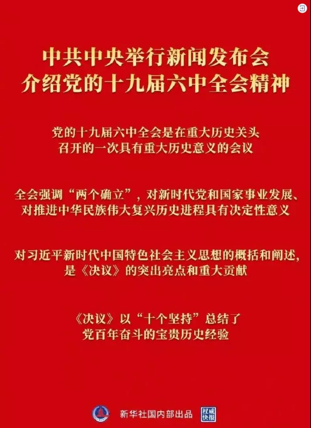 11月8日至11日,中国共产党第十九届中央委员会第六次全体会议胜利举行,全会审议通过了《中共中央关于党的百年奋斗重大成就和历史经验的决议》,《决议》全面总结了党的百年奋斗重大成就和历史经验,是一篇光辉的马克思主义纲领性文件 ,是新时代中国共产党人牢记初心使命、坚持和发展中国特色社会主义的政治宣言,是以史为鉴、开创未来、实现中华民族伟大复兴的行动指南。