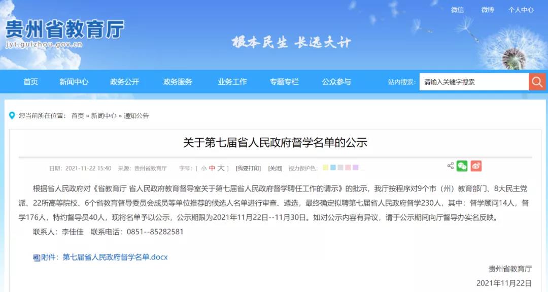 11月22日,省教育厅公示第七届省人民政府督学名单,我校校长翟理红入选。本届共拟聘督学230人,公示期限为2021年11月22日--11月30日。