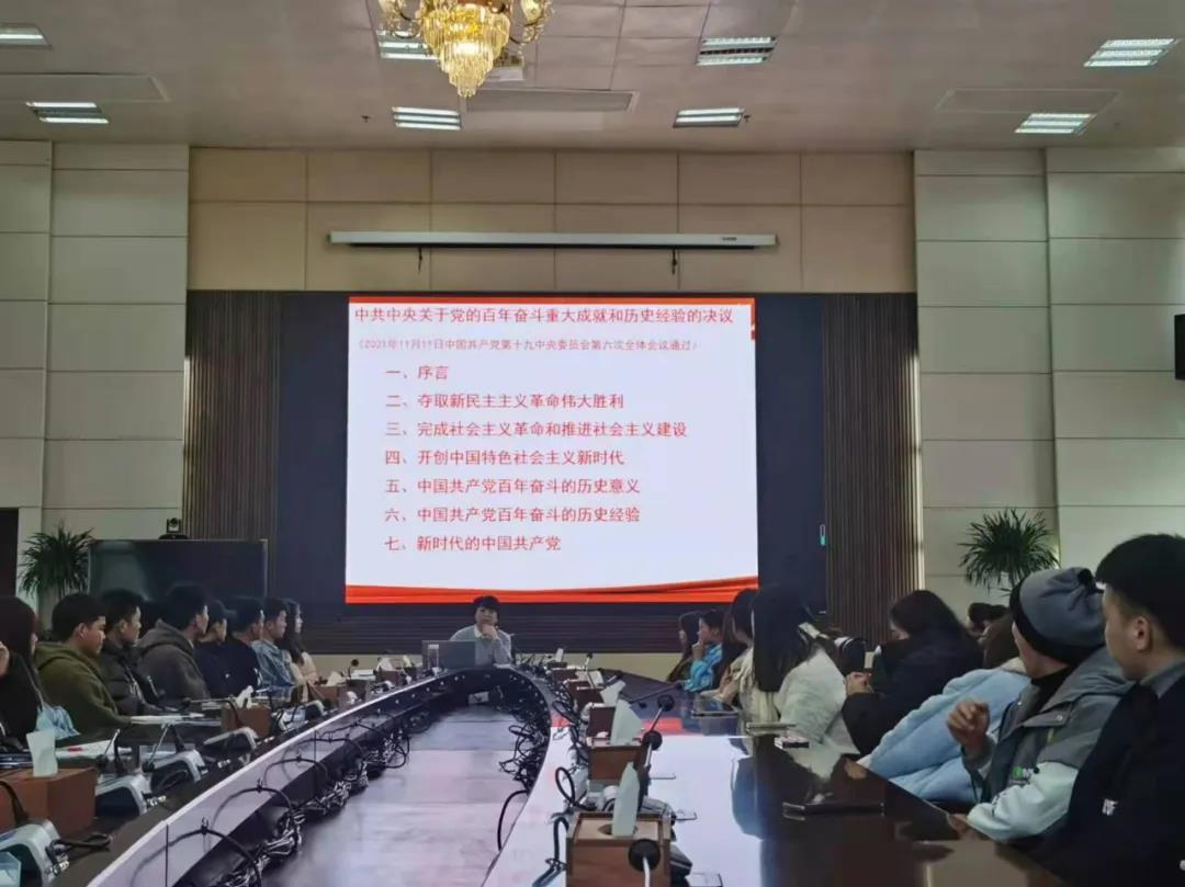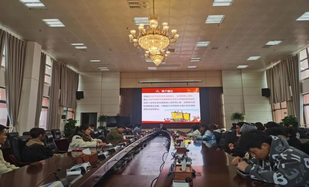 以四个时期、四个伟大飞跃、四个庄严宣告、马克思主义中国化的三次飞跃、十个明确、两个确立、十三个方面的历史性成就、历史性变革、五大历史意义、十大经验、三个必须等为线索详细地解读《决议》的主要内容。在宣讲中着重讲解了“两个确立”的重要性,引导同学们自觉增强“四个意识”、坚定“四个自信”、做到“两个维护”。