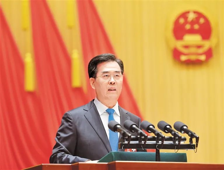 2022年1月20日上午,贵州省第十三届人民代表大会第五次会议在贵阳隆重开幕。图为李炳军作政府工作报告。贵州日报天眼新闻记者 闻双 摄