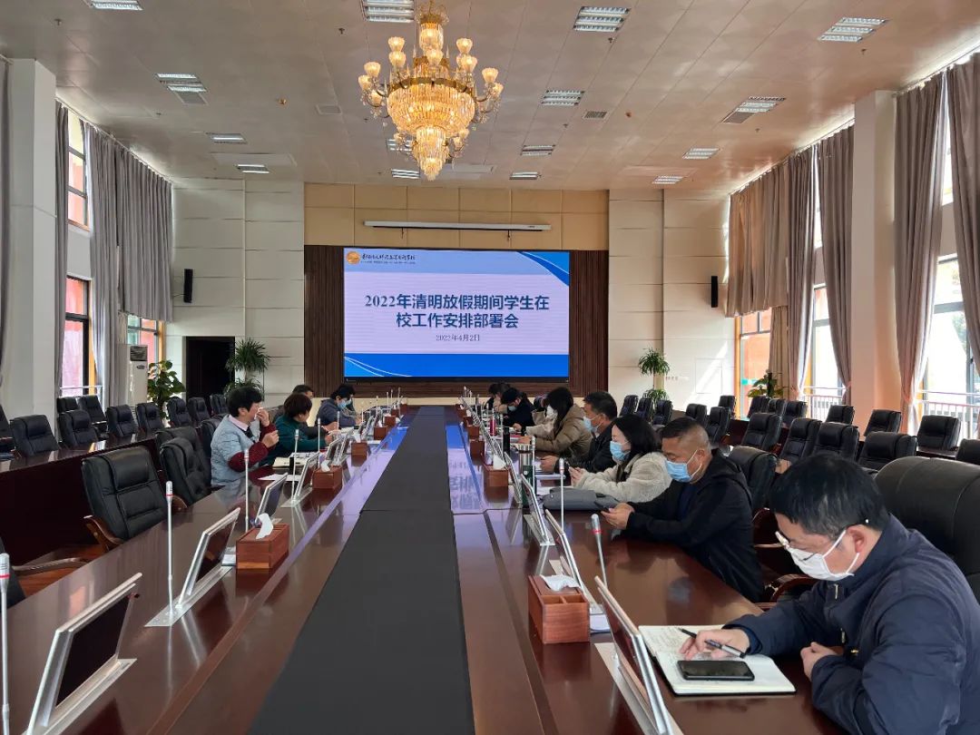 4月2日上午,为了更好地服务好学生,我校在时光校区召开2022年清明放假期间学生工作安排部署会。校长翟理红主持会议,校党委书记张曦,党委副书记李炳昌,副校长赵雅卫、潘丽芬、张世琴出席会议,各相关部门、各系部主要负责人参加会议。