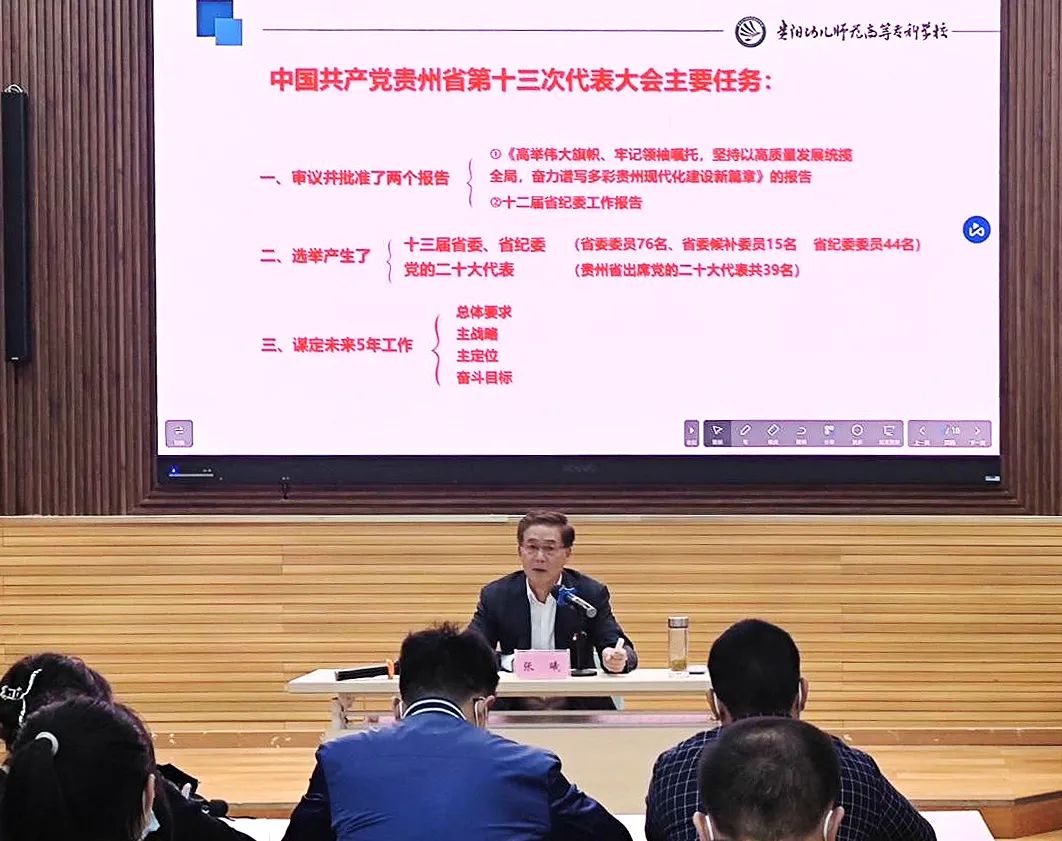 5月18日,按照省委、市委及校党委工作部署及要求,学前教育与早期教育系党总支“学习贯彻省第十三次党代会精神省委宣讲报告会”在时光校区学前合班教室二举行。本次宣讲会由贵阳幼儿师范高等专科学校党委书记张曦同志主讲,学早系全体师生党员、入党积极分子到场聆听。