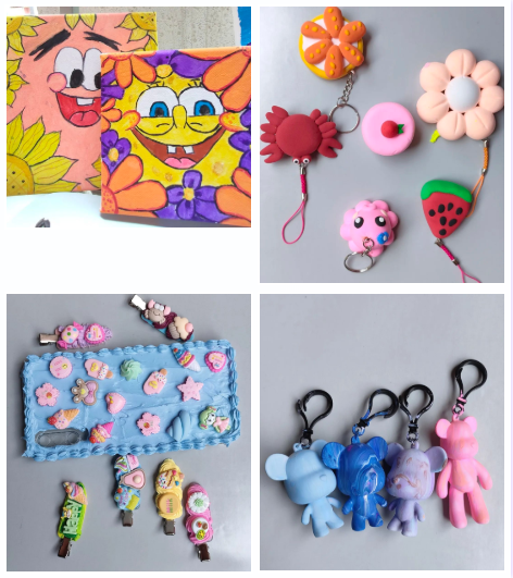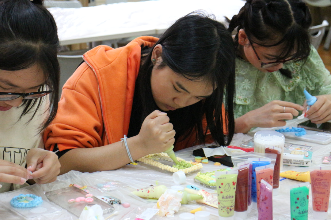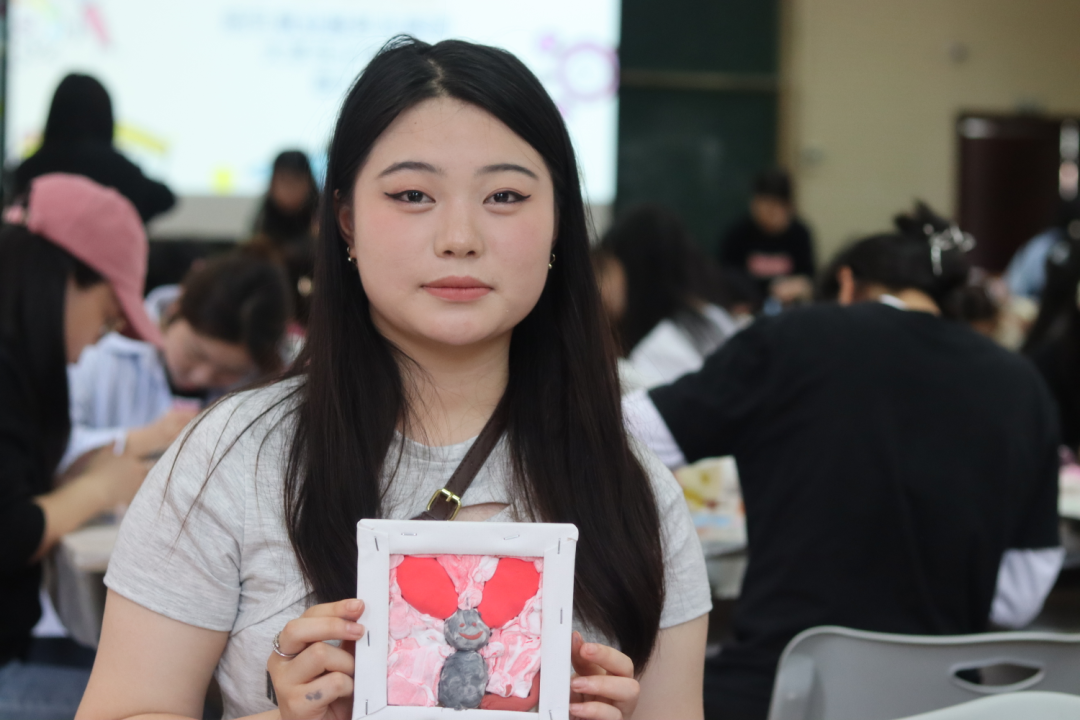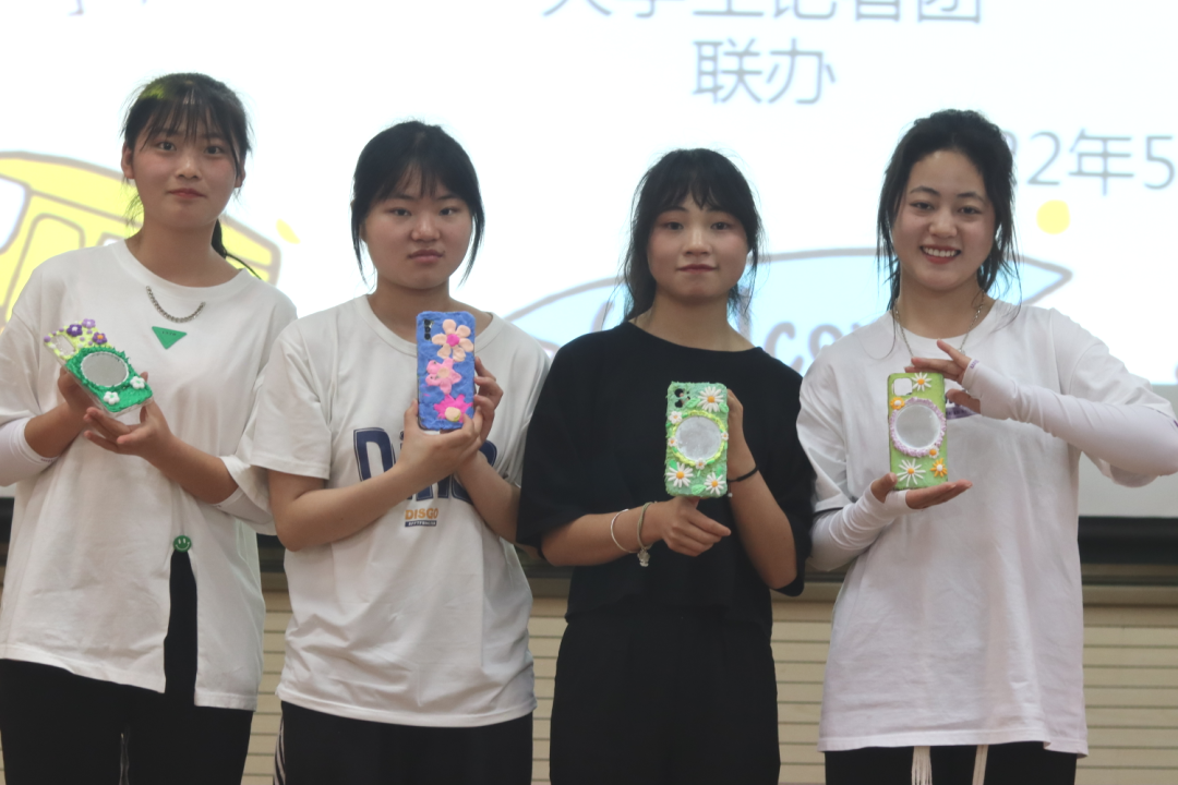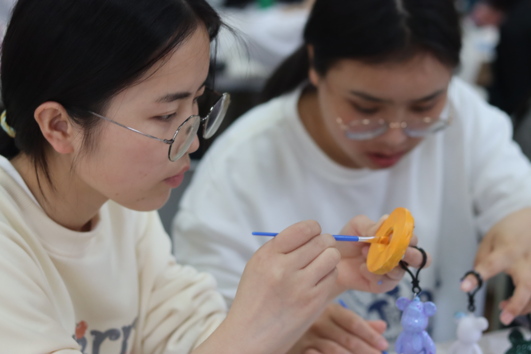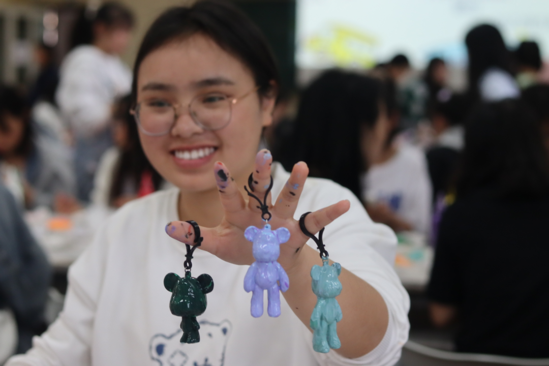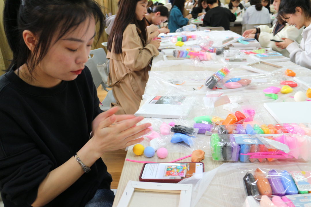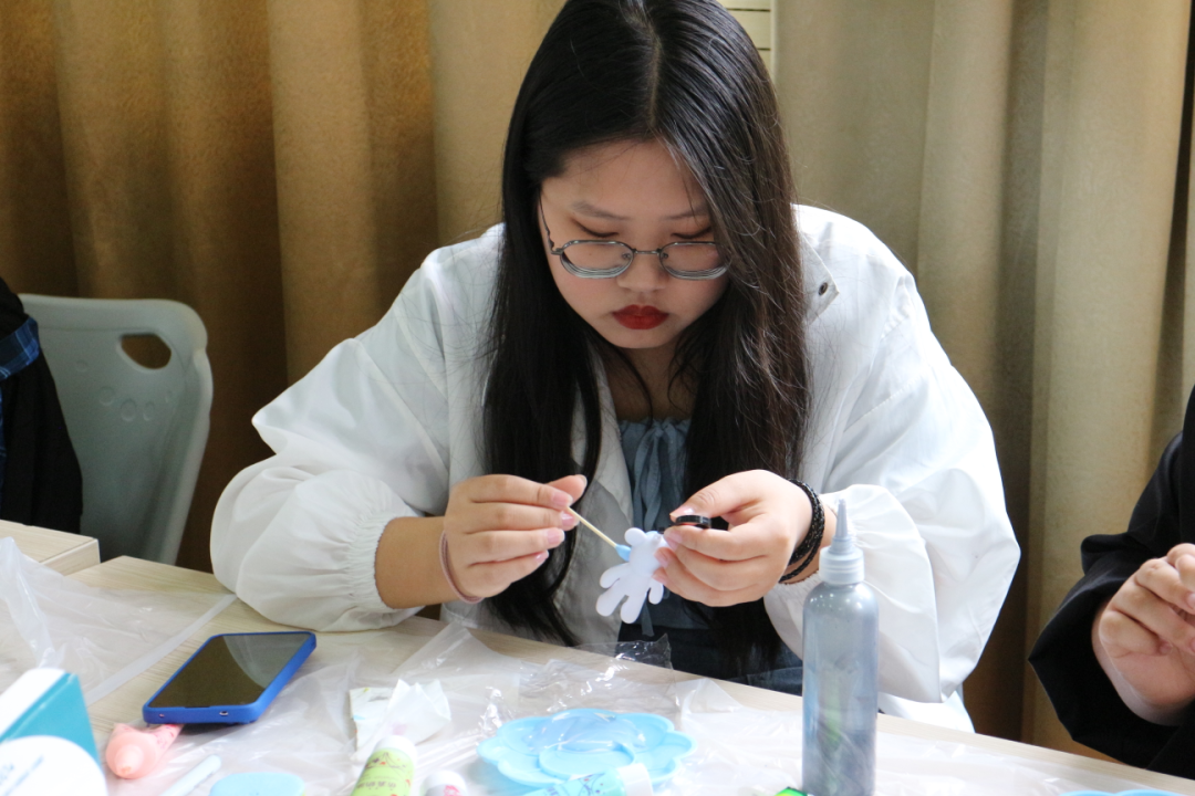 各式各样的流体熊、艺术画布、口罩、发卡、手机壳……多种材料映入眼帘。同学们早早地带着伙伴来到活动现场,选择自己喜欢的材料开始手工“创作之旅”。现场氛围其乐融融,大家在优美的音乐声中精心打造自己的作品;各式各样的物件在一双双巧手下显得别具一格。