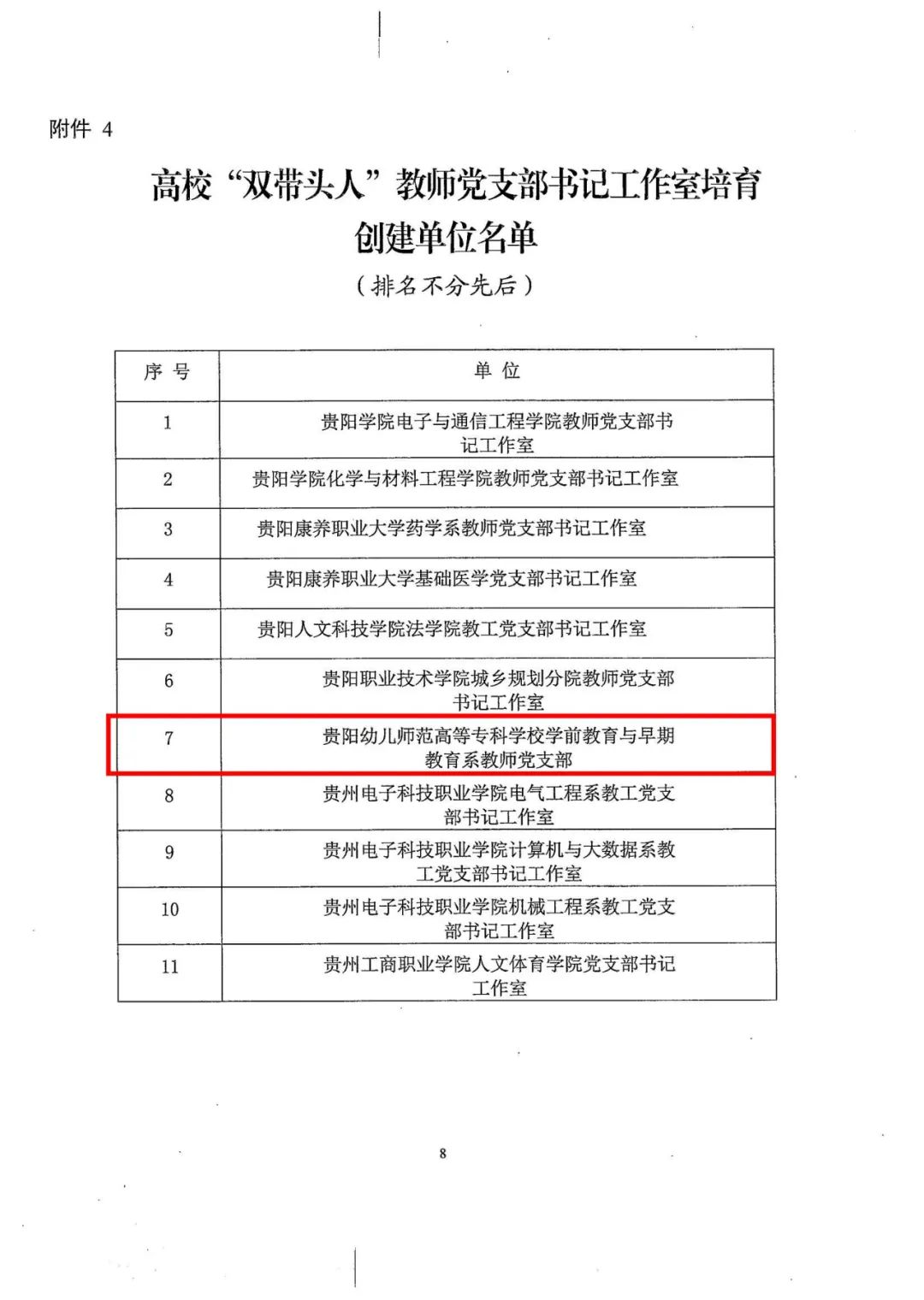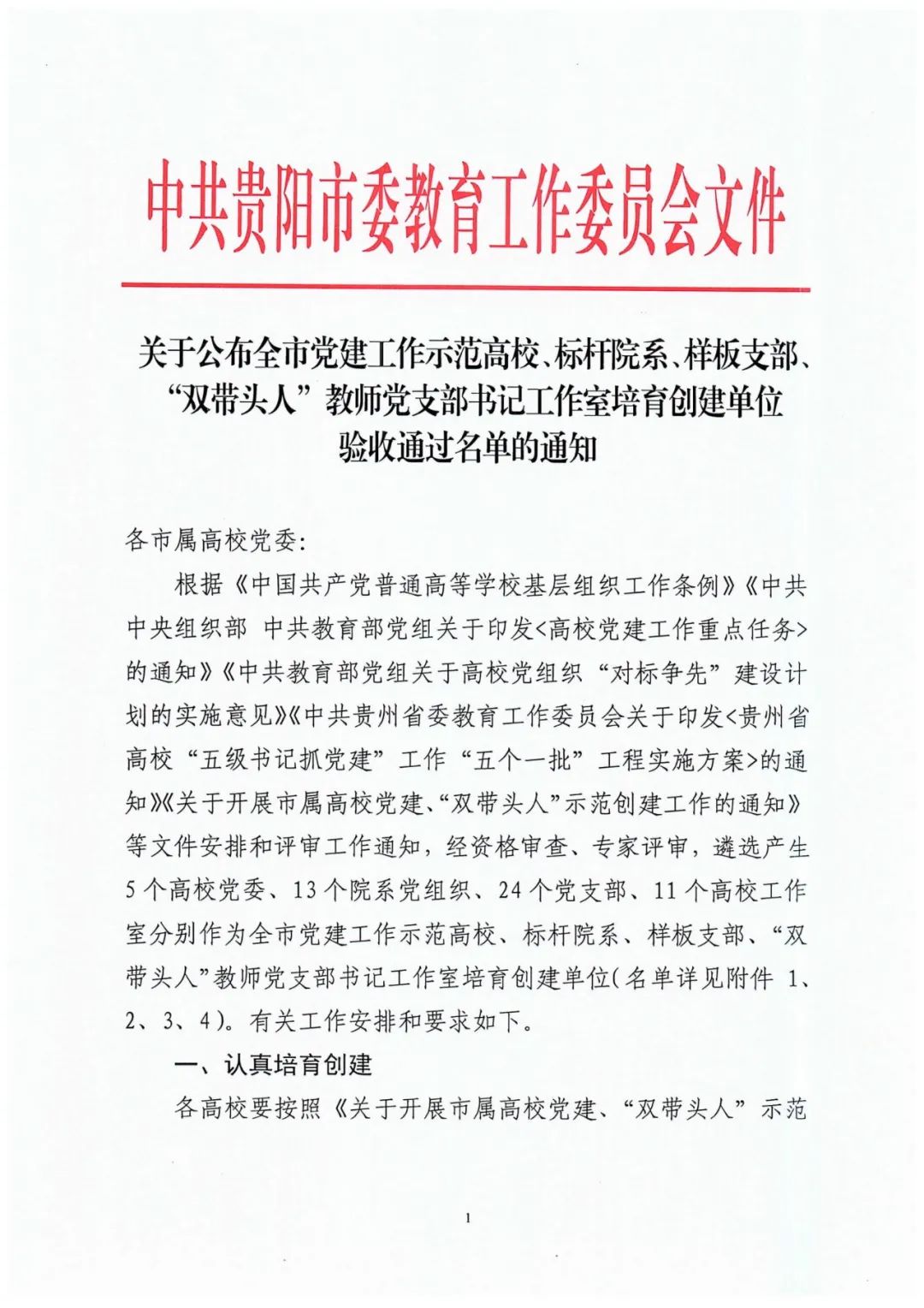 近日,中共贵阳市委教育工作委员会发布公告,公布全市党建工作示范高校、标杆院系、样板支部、“双带头人”教师党支部书记工作室培育创建单位验收通过名单。
