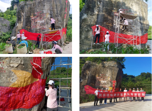 7月3日下午至4日,民族团结进步宣讲队在中坝村村口组织开展了“团结一家亲,党旗在我心”活动。队员们为入村石上已经淡化了的“中坝村”和“村规民约”字样重新填涂颜色,设计了“飘扬的党旗和中华柱”图样,在村委会和村民的大力支持下,经过为期两天的填色、绘画,绿色的园野映衬了鲜红的党旗,队员们的努力使入村石焕然一新。队员们表示:在烈日炎炎下,每一笔一划,虽然辛苦,但深感荣幸与自豪,大家用实际行动践行“党旗在心中”的重大意义。
