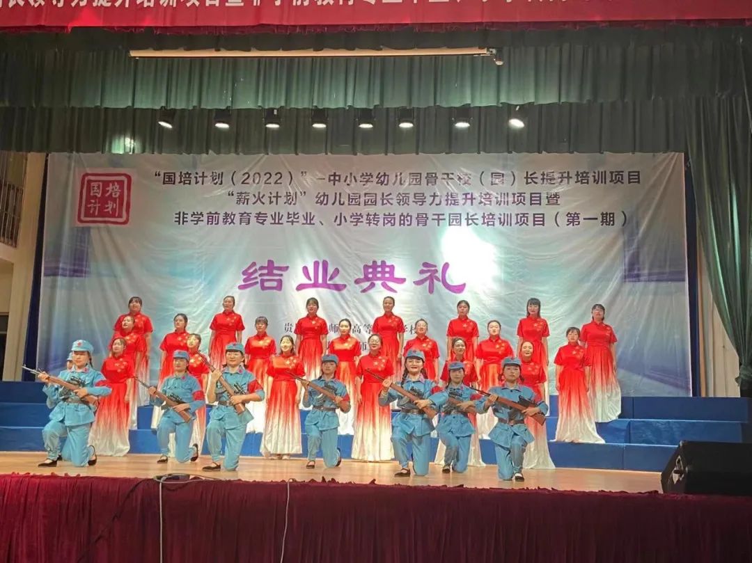 本次培训为期20天,在培训中,贵阳幼儿师范高等专科学校通过组建包含高校教师、一线教研员、一线教师的专家团队,围绕《幼儿园管理条例》、《幼儿园教育指导纲要》、《幼儿园工作规程》、《幼儿园办园行为督导评估办法》、《幼儿园园长专业标准》、《贵州省幼儿园分类评估指标》、《3—6岁儿童学习与发展指南》等幼儿园办园、治园指导性文件设置课程,安排了包括集中培训、实践观摩、线上研修、返岗实践等丰富多样的培训形式,为参训园长、教师的专业发展提供了有力支持。