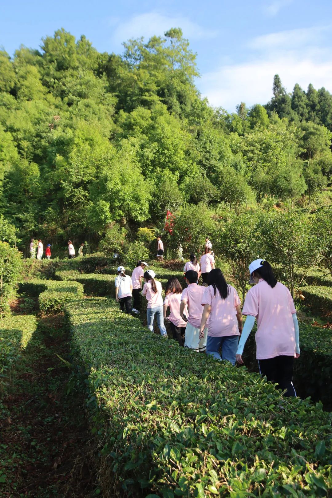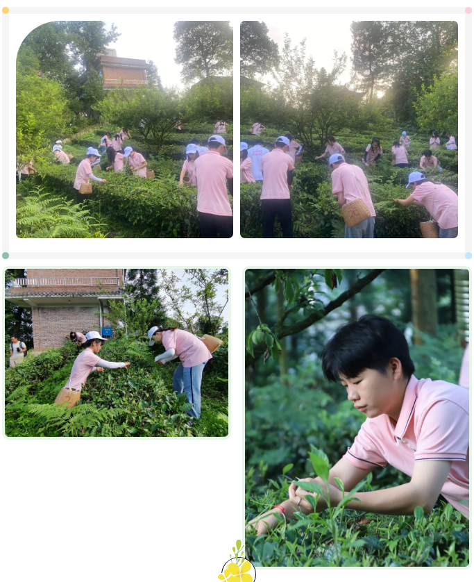 7月5日早7:00,实践队开展了围绕“体验采茶乐趣·感受劳动艰辛”为主题的劳动体验活动,当清晨的第一缕阳光透过树叶的缝隙,实践队同学们就迎着朝阳进入了茶山,在茶师傅的指导下,纷纷开始了采茶工作。