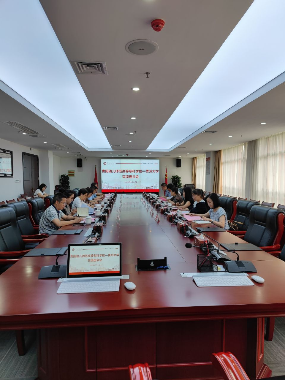 贵州大学校党委副书记令狐彩桃欢迎我校一行并介绍贵州大学情况。贵州大学教务处、教师工作处、科学技术研究院、哲学社会科学研究院、马克思主义学院、工程训练中心教研室分别介绍了部门工作情况,随后,两校对口部门进行了深入交谈,初步确定两校携手发展的合作内容。