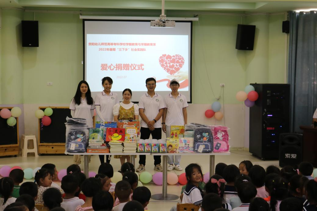 实践期间,学前教育与早期教育系暑期“三下乡”社会实践团队为息烽县鹿窝镇中心幼儿园的困难留守儿童捐赠了书包、图书、彩笔等学习用品,共计一万余元,并给幼儿园小朋友呈现了一场精彩纷呈的演出。