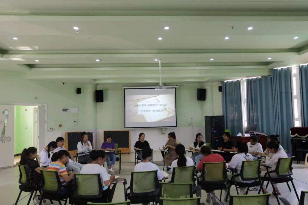 基于一周跟班进园实践经历,实践队员在团队老师时瑶、周勇、朱梦黎的指导下与鹿窝镇中心幼儿园全体教师开展了教研活动,重点就教师如何推进游戏计划、游戏故事、游戏分享等环节所面临的困惑进行探讨,以更好提升幼儿园自主游戏的质量,促进在园儿童的和谐发展。