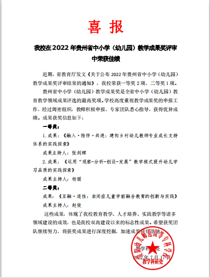 近期,省教育厅发文《关于公布 2022 年贵州省中小学(幼儿园)教学成果奖评审结果的通知》,我校荣获一等奖 2 项,二等奖 1 项。