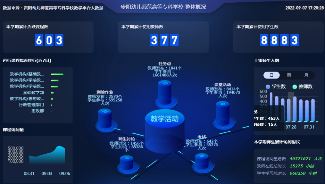 疫情防控管理中,学校高度重视教学工作,从上至下层层落实、积极部署,将“保学”放在重要位置。9月5日,学校全面落实云端教学,保障全校师生“不缺一节课、不停一日学”。老师们以钉钉直播、学习通直播的方式授课。“线上”教学开展前三日,我校“云端”授课情况良好,累计活跃课程为603门次,授课教师累计377人次,学生在线学习累计8883人次。