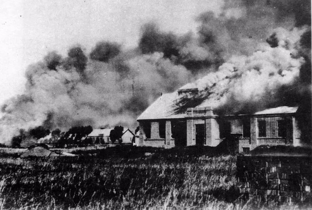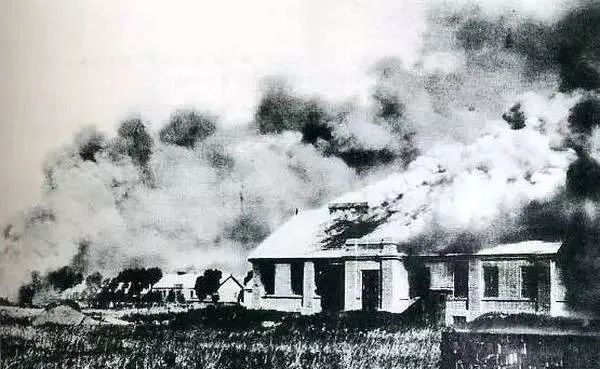 1931年9月18日夜,日本关东军炸毁沈阳北郊一段南满铁路的路轨,制造借口进攻中国东北军驻地北大营,发动了“九一八事变”。图为烧毁中的北大营
