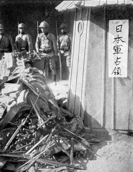 日军侵占沈阳城后,耀武扬威地站在城头,悬挂起日本国旗