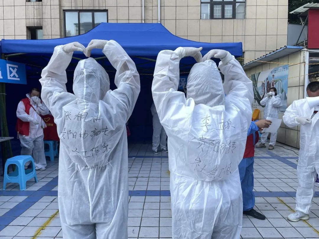 社工系学生陈丽霓、余丽华、李雅翠在新创路街道办事处 新欣社区做志愿者、协助开展核酸采集工作
