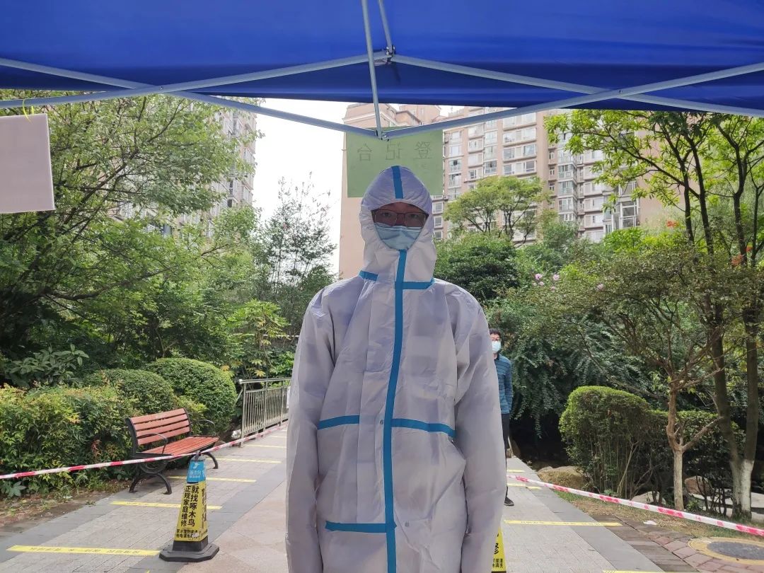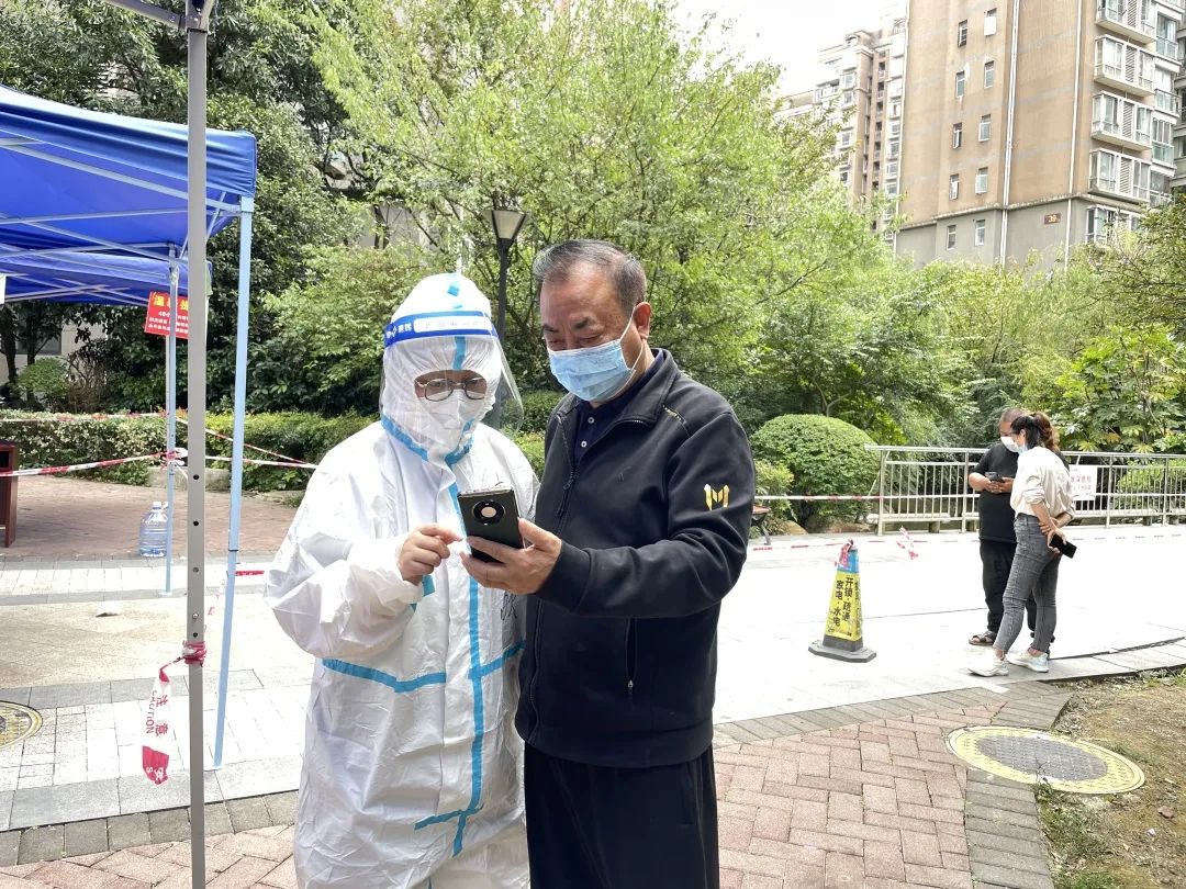 社工系学生李玉頔、张彤菊在新 南明区青山小区协助开展核酸采集工作。