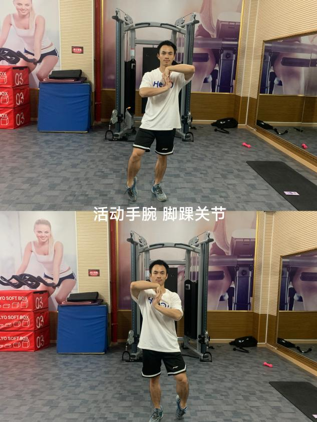注意:此热身动作让身体进入紧张状态、让肌肉神经有募集感 、增加各关节滑膜积液、 防止损伤。