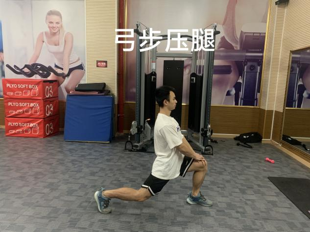 两侧共30秒,15秒换腿。自然站立,一腿迈向前方大概一个脚掌的距离,身体正直,挺胸收腹。后退微曲向下坐,前腿伸直,身体正值状态向前趴,左右交替进行。(根据自身能力把握动作速度和节奏,可自行延长数秒时间。)