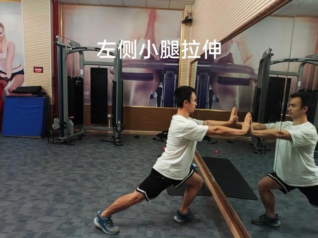 30秒。面向墙壁,屈肘扶墙;右腿前弓步,右脚脚尖抵墙;左腿后侧伸直,左脚脚跟踩地;臀部下沉,感受左小腿后侧的牵拉感。(根据自身能力把握动作速度和节奏,可自行延长数秒时间。)