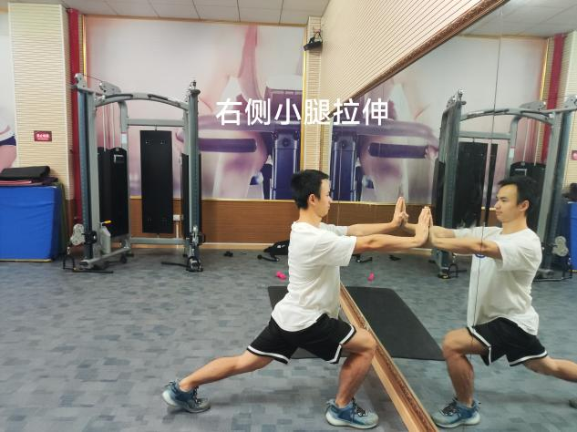 30秒。面向墙壁,屈肘扶墙;左腿前弓步,左脚脚尖抵墙;右腿后侧伸直,右脚脚跟踩地;臀部下沉,感受右小腿后侧的牵拉感。(根据自身能力把握动作速度和节奏,可自行延长数秒时间。)