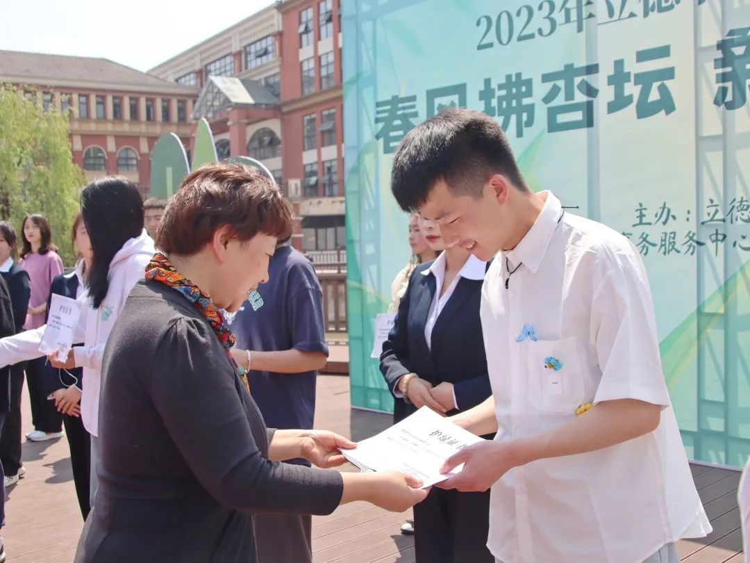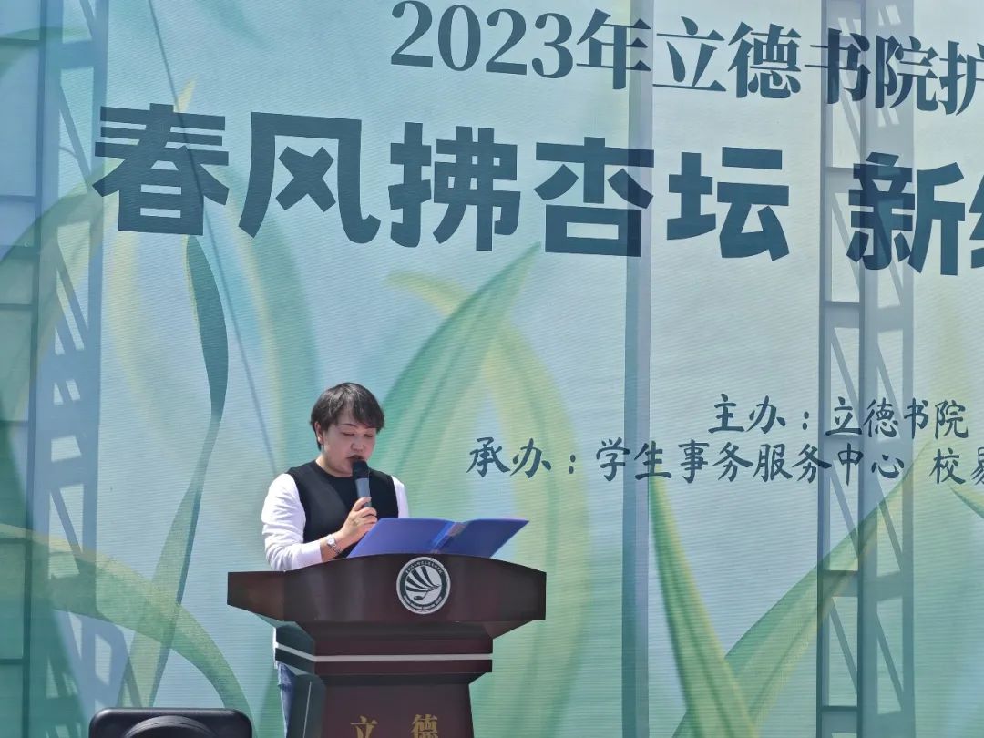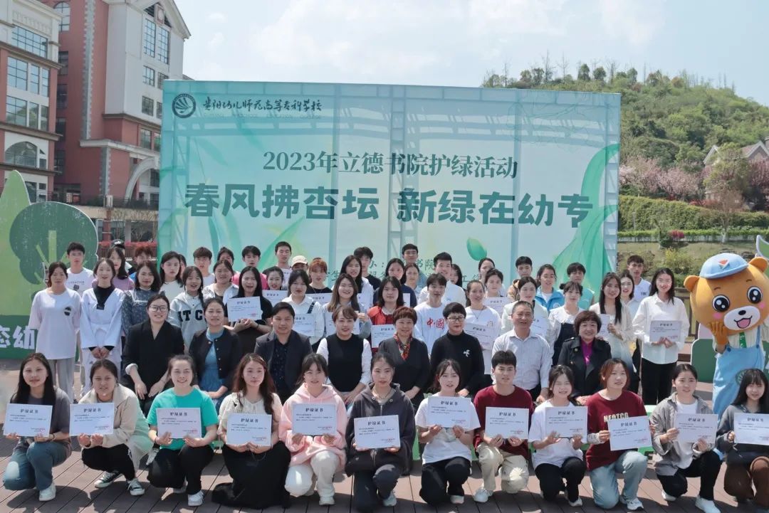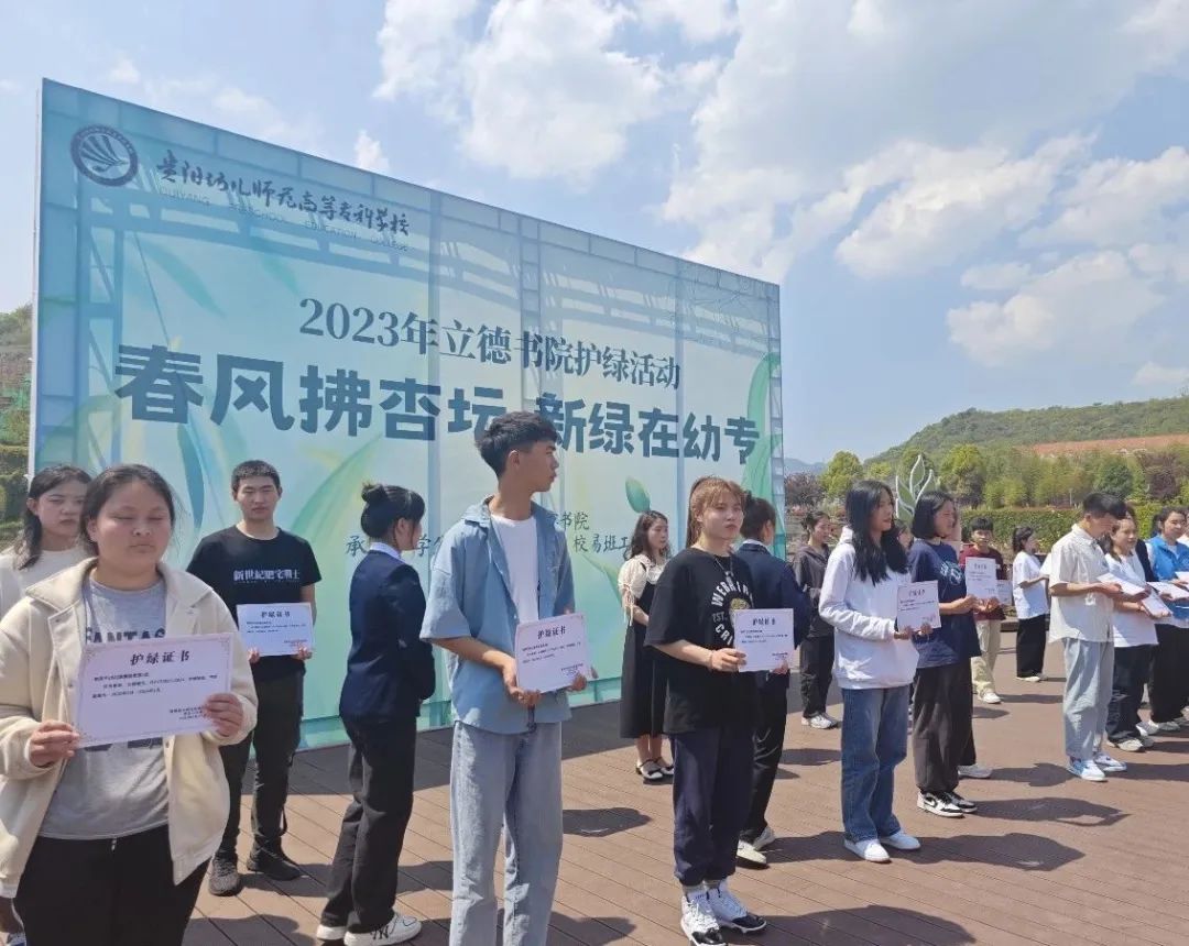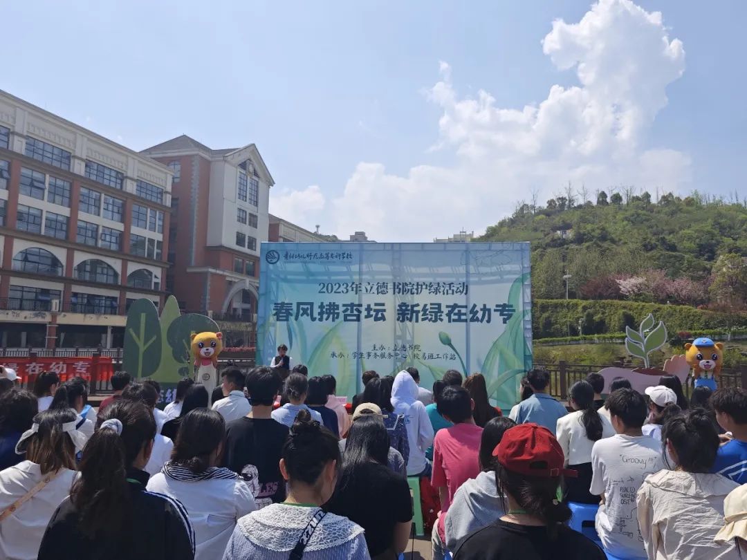 近日,立德书院在曰生湖旁举行2023年“春风拂杏坛 新绿在幼专”果树认领仪式,校长翟理红出席本次活动,学生工作处负责人主持活动,各系部负责人、果树认领班级学生代表等参加。