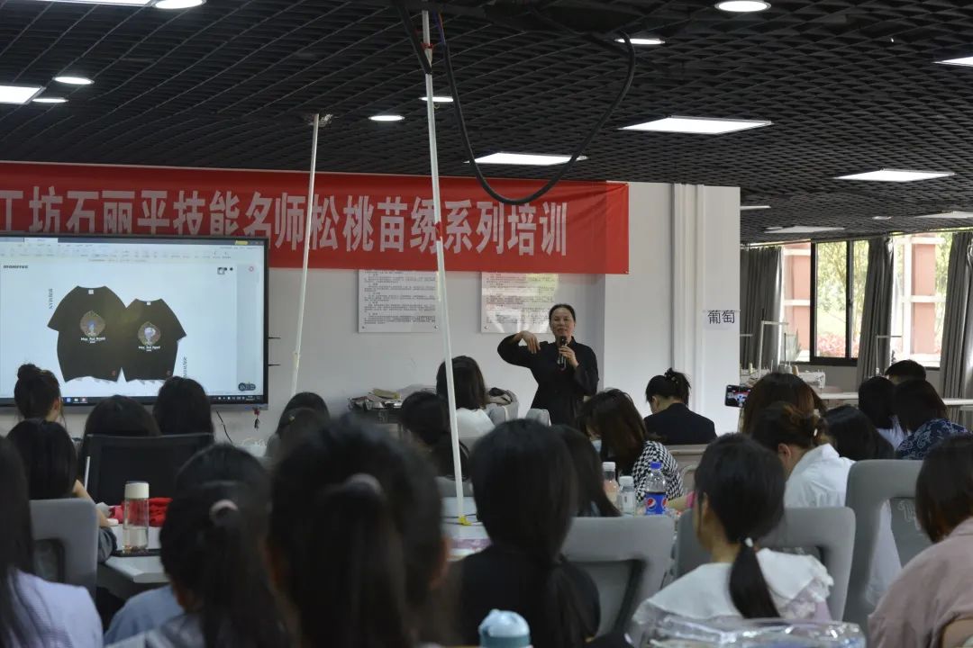 石丽平对产品艺术设计专业教师及技能大赛备赛学生进行了苗绣技法指导,针对苗绣纹样的针法设计进行了具体分析。师生通过苗绣技法的指导,对结合图案进行针法设定的思路更加明确,对具体的苗绣针法技术更加精进。