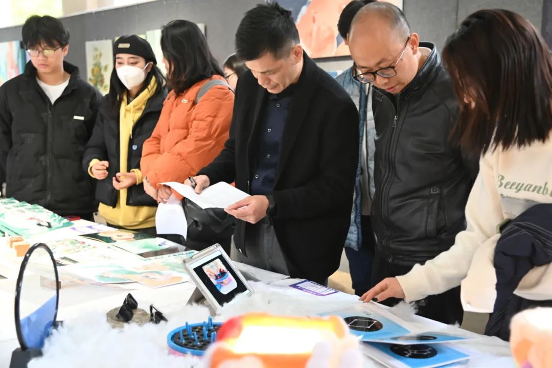 开幕式结束后,与会领导嘉宾、师生走进展厅参观展出作品,并对学生作品进行点评交流,提出指导意见建议,让学生更好认识到自己作品的优点和不足,帮助学生进一步提高自身创作能力。参展作品的多样性和创新性充分展示了同学们在专业学习中的扎实基础和在创新、创意、创造等方面的卓越能力。从细腻入微的美术教育作品到大胆创新的产品艺术设计,从灵动飘逸的书画艺术到实用美观的环境艺术设计,每一件作品都充分展现了同学们的专业素养和艺术才华。值得一提的是,本次展览的主题“艺境探索,设计无疆”更是将观众带入了一个无限想象的艺术世界。这一主题不仅鼓励同学们在艺术创作中勇于探索新的艺术境界,更强调了设计与现实生活、社会环境以及未来发展之间的紧密联系。