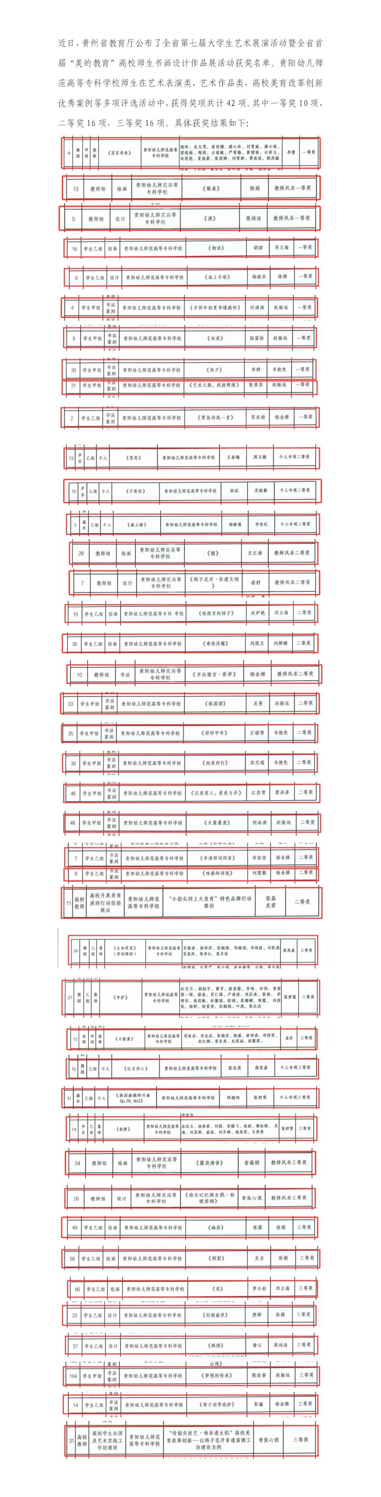 近日,贵州省教育厅公布了全省第七届大学生艺术展演活动暨全省首届“美的教育”高校师生书画设计作品展活动获奖名单。整场活动在学校大力支持下,由艺术系精心筹划组织,历时近10个月的时间。我校师生在艺术表演类、艺术作品类、高校美育改革创新优秀案例等多项评选活动中,获得奖项共计42项,其中一等奖10项,二等奖16项,三等奖16项。