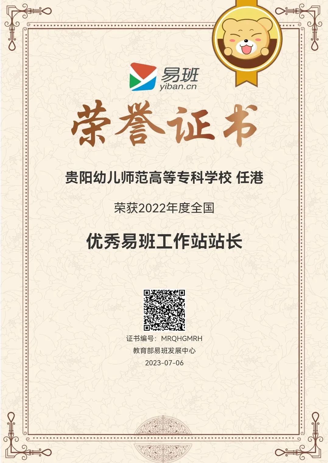 (图为2022年度全国优秀易班工作站站长证书)