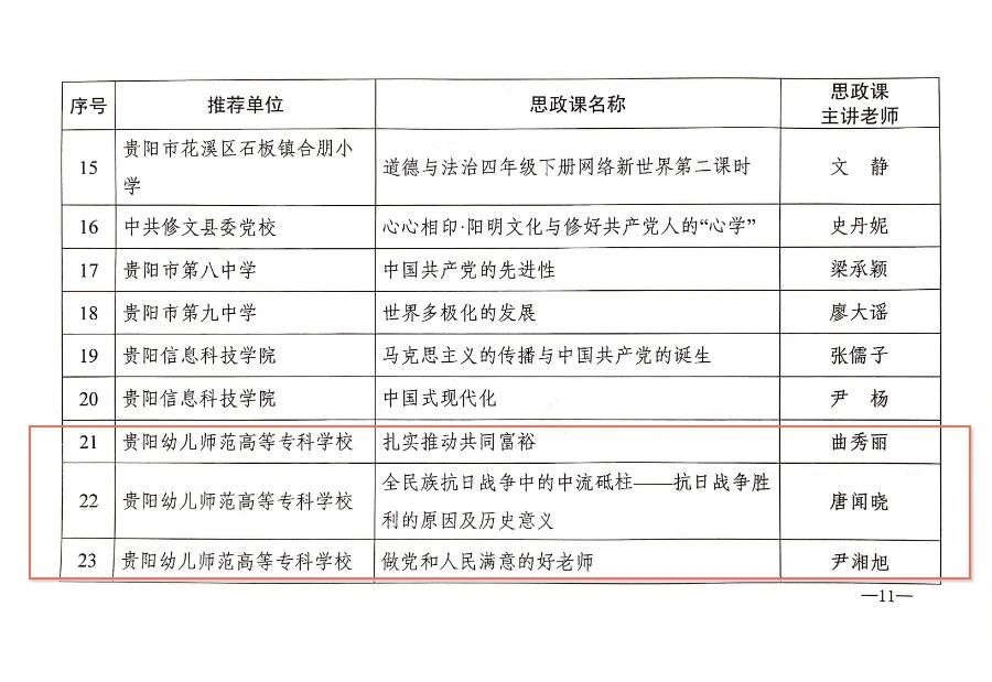 在“2023年贵阳贵安思政大课堂优秀思政课征集活动”的评选中,我校荣获优秀组织奖,校思政教学部教师尹湘旭、曲秀丽、唐闻晓、张晴晴、张可取得优秀成绩!