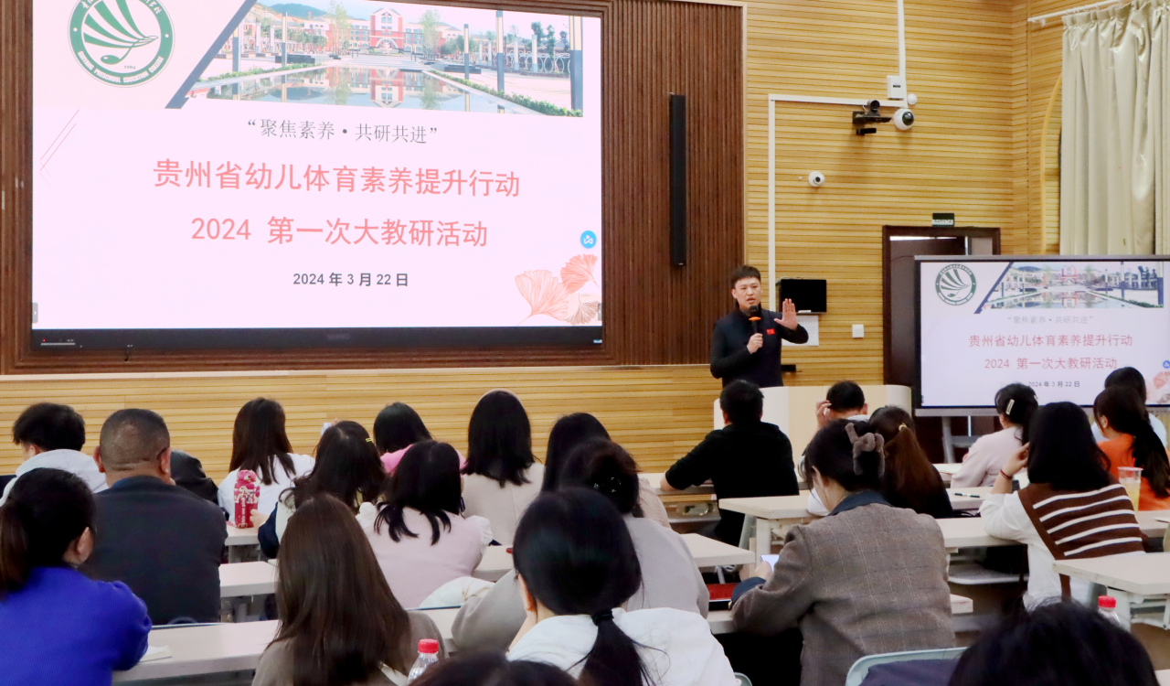 受贵州省教育厅委托,我校儿童动商研究中心2023年7月发起了“全省幼儿体育素养提升行动”。根据提升行动2024年度工作计划,今日在我校开展2024年第一次大教研活动,全省各地州市140余名园长、教师参会。本次教研活动主题为“聚焦健康·共研共进”,目的是落实贵州省委十三届三次全会提出的“幼有善育”相关要求,推动“全省千万师生阳光体育运动”在幼儿园的开展,夯实贵州省幼儿体育素养提升。
