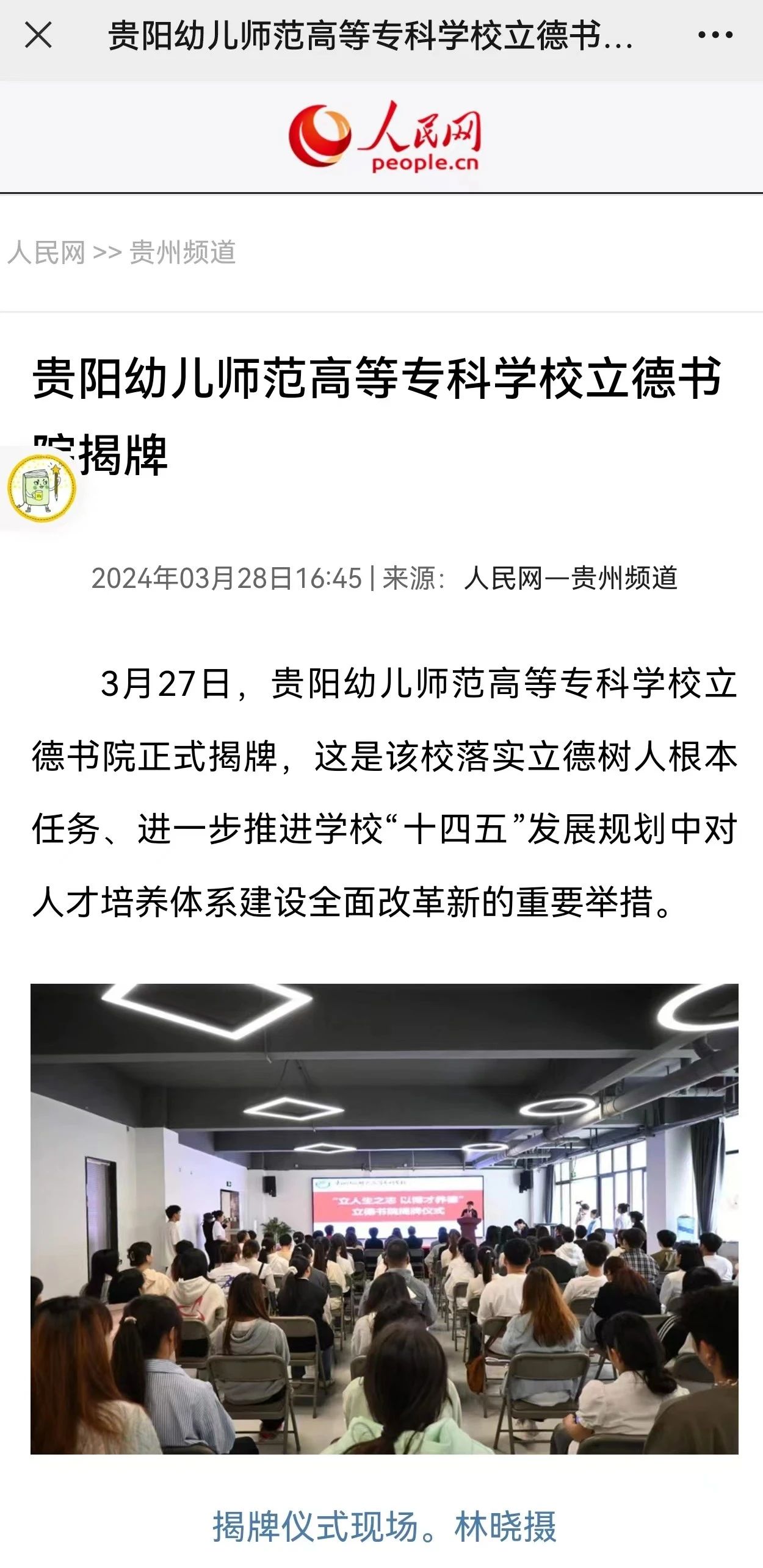 3月27日,贵阳幼儿师范高等专科学校立德书院正式揭牌,这是该校落实立德树人根本任务、进一步推进学校“十四五”发展规划中对人才培养体系建设全面改革新的重要举措。