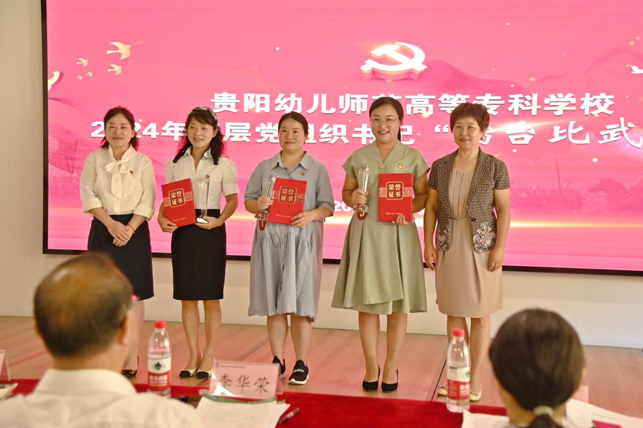 经过激烈地角逐,最终学前教育与早期教育系教师党支部书记杨丽、艺术系学生党支部书记张依曼荣获一等奖;直属机关第八党支部书记孙立枫、学前教育与特殊教育系学生党支部书记王纪政、社会工作系学生党支部书记王婷荣获二等奖;基础教学部学生党支部书记陈婷、思想政治理论课教学部党支部书记骆洪军、艺术系教师党支部书记陈晴、体育与健康系学生党支部书记李庆荣获三等奖。与会领导分别为获奖选手颁发了荣誉证书和奖杯。