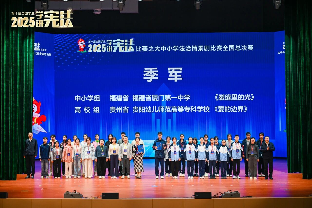 11月10日,在教育部主办的2025年第十届“学宪法 讲宪法”比赛之大中小学法治情景剧比赛全国总决赛中,我校省级名辅导员工作室——颂法辅导员工作室主持人李元,成员罗玉卿、孙拉拉老师指导的作品《爱的边界》荣获佳绩。
