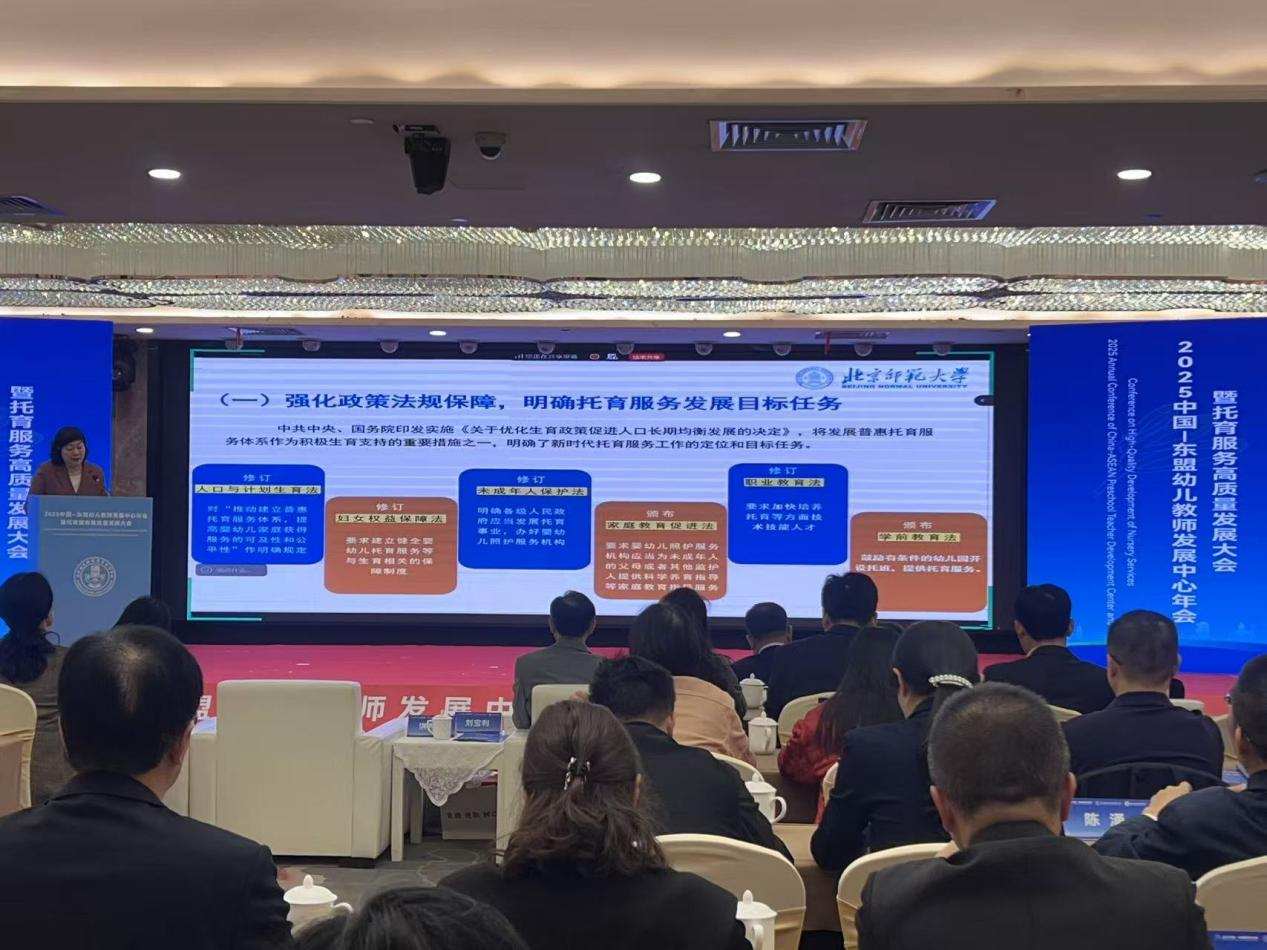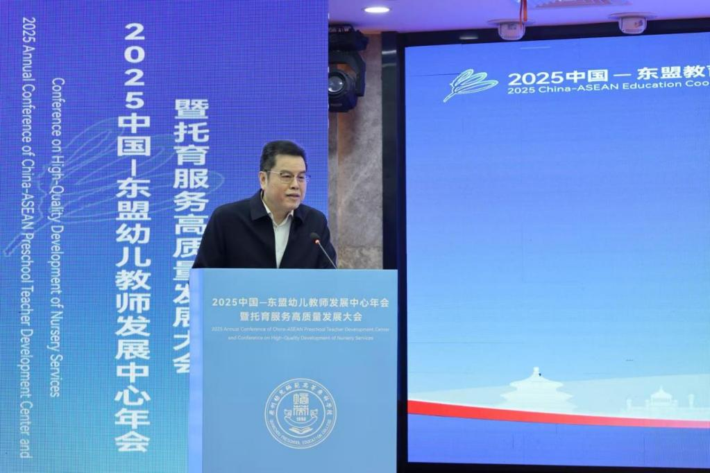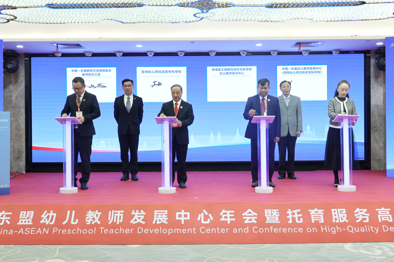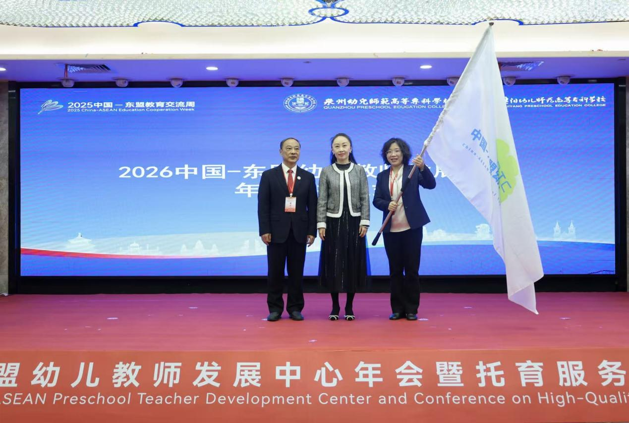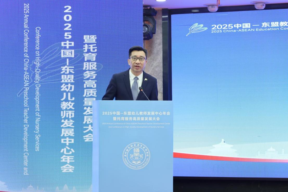 11月29日,2025中国-东盟幼儿教师发展中心年会暨托育服务高质量发展大会在福建泉州圆满举行。本次年会由中国-东盟教育交流周组委会秘书处指导,中国-东盟幼儿教师发展中心(贵阳幼儿师范高等专科学校)以及福建分中心(泉州幼儿师范高等专科学校)共同承办。原教育部国际司巡视员、中国-东盟教育交流周组委会执行秘书长刘宝利,贵州省教育厅党组成员、副厅长、中国-东盟教育交流周组委会副秘书长白震,福建省教育厅二级巡视员王越忠,中国-东盟教育交流周组委会秘书处办公室主任陈文益出席会议。