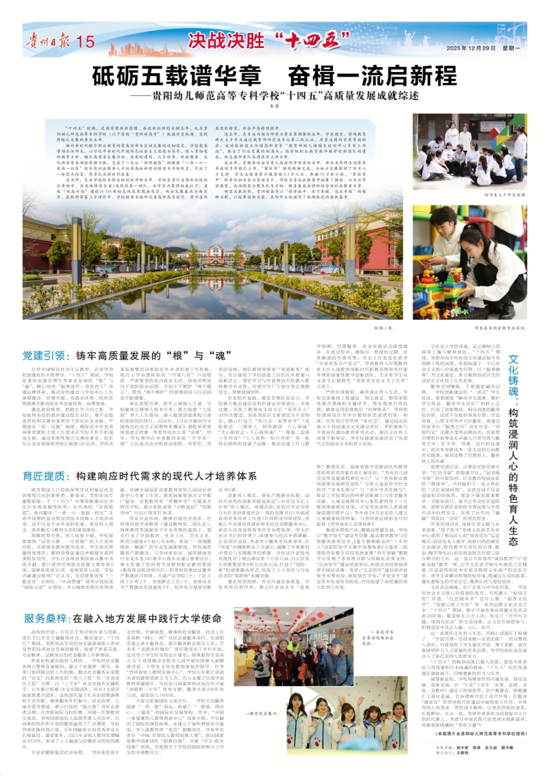12月29日,《贵州日报》以专版形式刊载学校 “十四五” 时期改革发展纪实文章,全景呈现了学校在党委领导下,紧扣高质量发展目标,深耕党的建设、人才培养、社会服务、文化传承等领域,从传统“幼师摇篮” 转型为服务“一老一小...